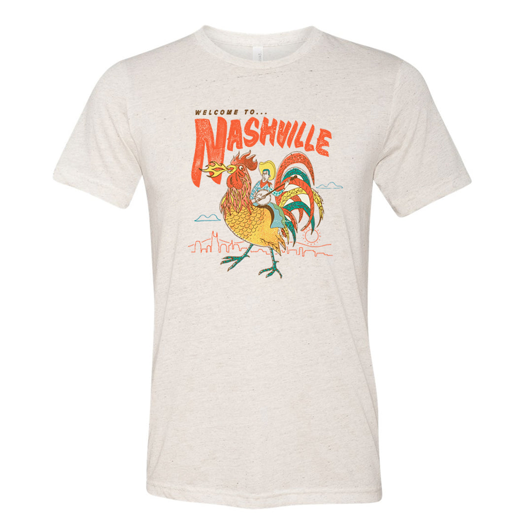 All aboard the hot chicken express! What’s more Nashville than a cowboy riding a fire-breathing chicken? We’re not sure, but it probably wouldn’t look this good on a shirt.